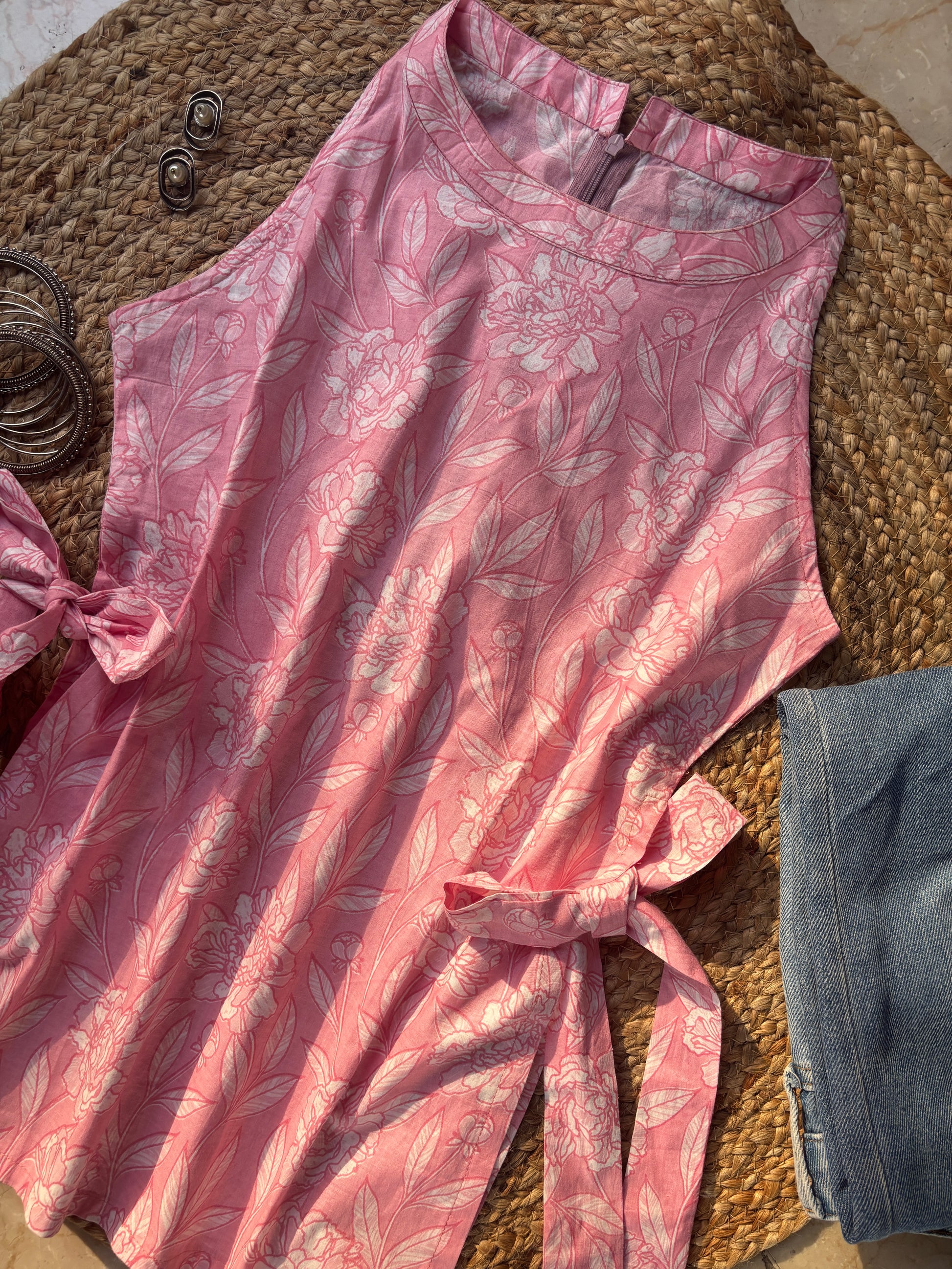 Elevate your everyday style with this charming baby pink halter-neck short kurti. Designed with a delicate white floral print, it exudes a fresh and feminine vibe. The side tie-up details add a trendy touch, ensuring a flattering fit. Crafted from breathable cotton, it’s perfect for casual outings, brunch dates, or summer getaways. Pair it with jeans, trousers, or skirts for a versatile, effortlessly chic look that blends comfort with elegance.