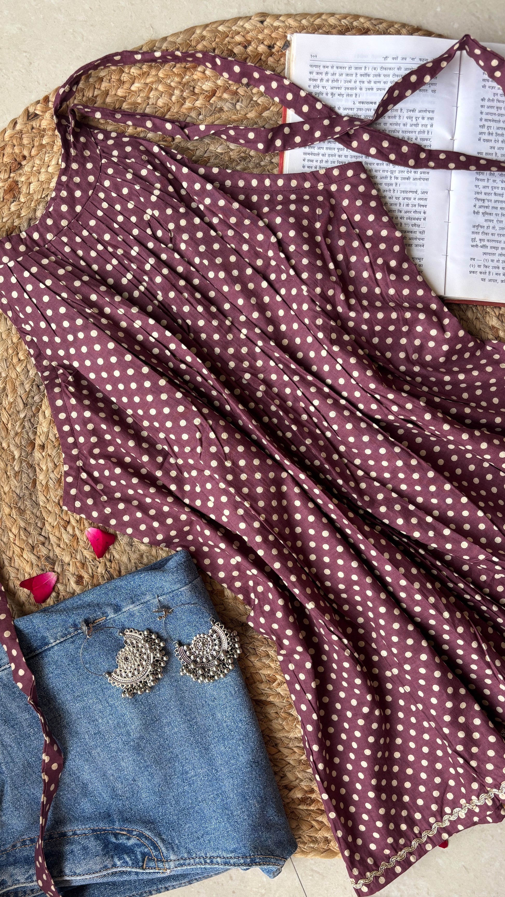 Brighten up your wardrobe with this vibrant burgandy short kurti featuring charming white polka dots. Crafted in a lightweight, flowy fabric, it’s designed with a gathered halter neck and tie-up shoulders for a breezy, elegant look. Perfect for casual outings or festive occasions, pair it with white trousers or jeans for effortless style and comfort. Finished with subtle lace detailing at the hem for a graceful touch.
