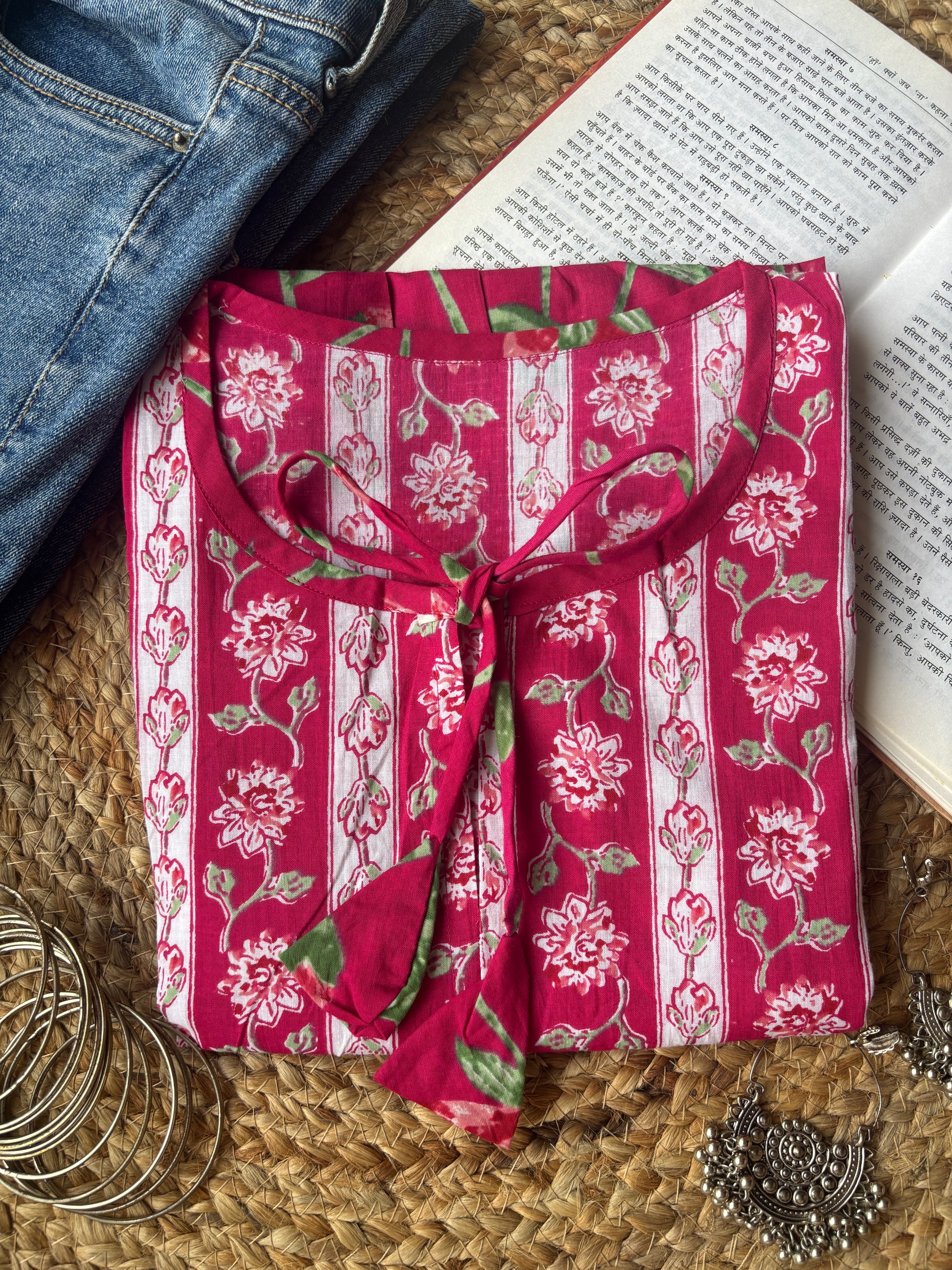 Add a pop of color to your wardrobe with this vibrant pink floral short kurti. Crafted from soft, breathable cotton, it features a relaxed fit with gathered detailing, 3/4th puffed sleeves, and a charming tie-up neckline. The intricate floral and stripe print blend tradition with a modern boho touch, making it perfect for casual outings, brunches, or festive gatherings. Pair it with denim or palazzos for effortless chic style.