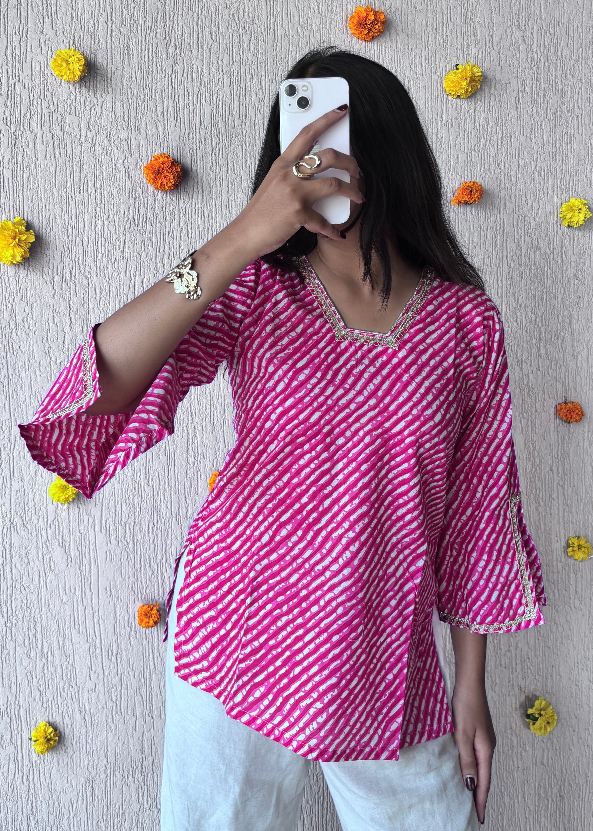 This vibrant pink short kurti brings a refreshing festive vibe to your look. Crafted from soft, breathable fabric, it features elegant diagonal stripes and delicate gota detailing around the neckline and sleeves. Perfect for casual outings, festive gatherings, or pooja days — this kurti blends comfort and effortless style beautifully. Pair it with white pants or denim for a chic, easy-going look.
